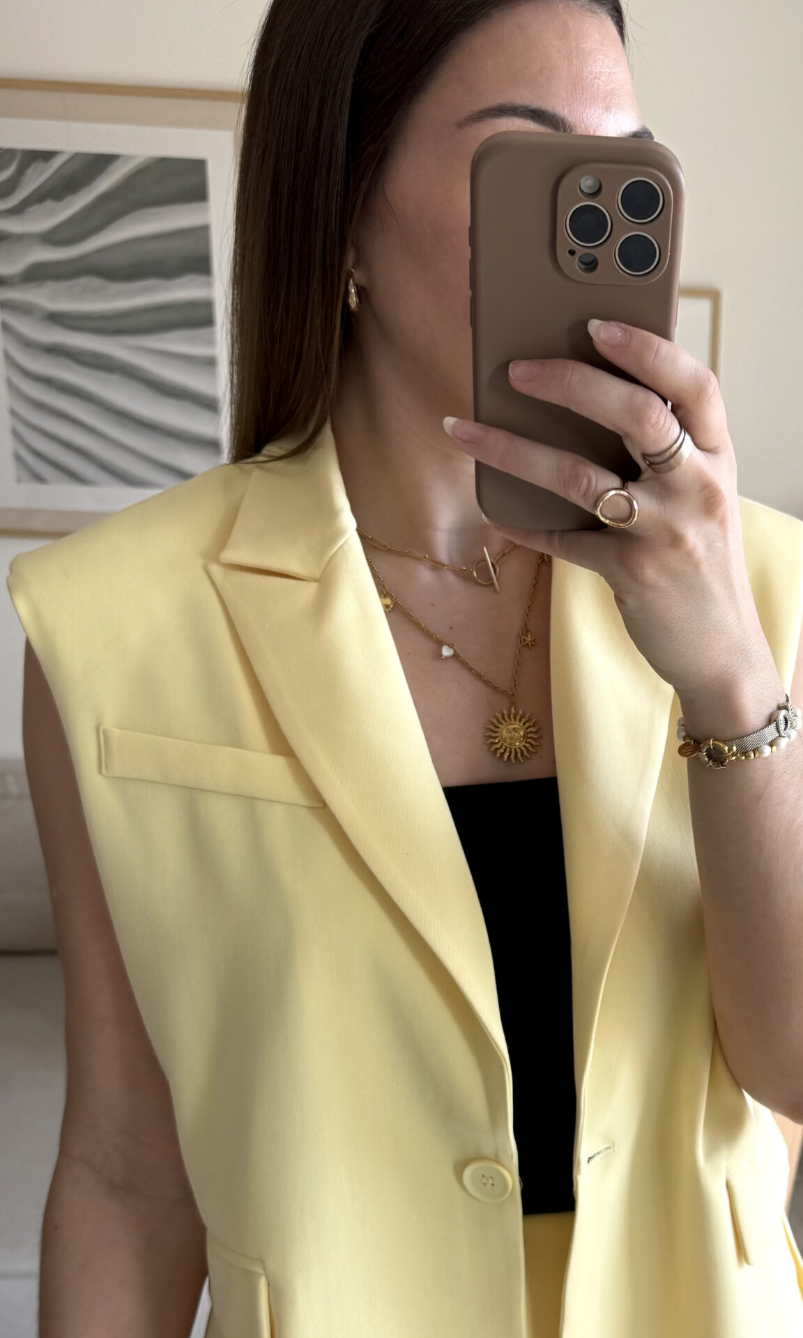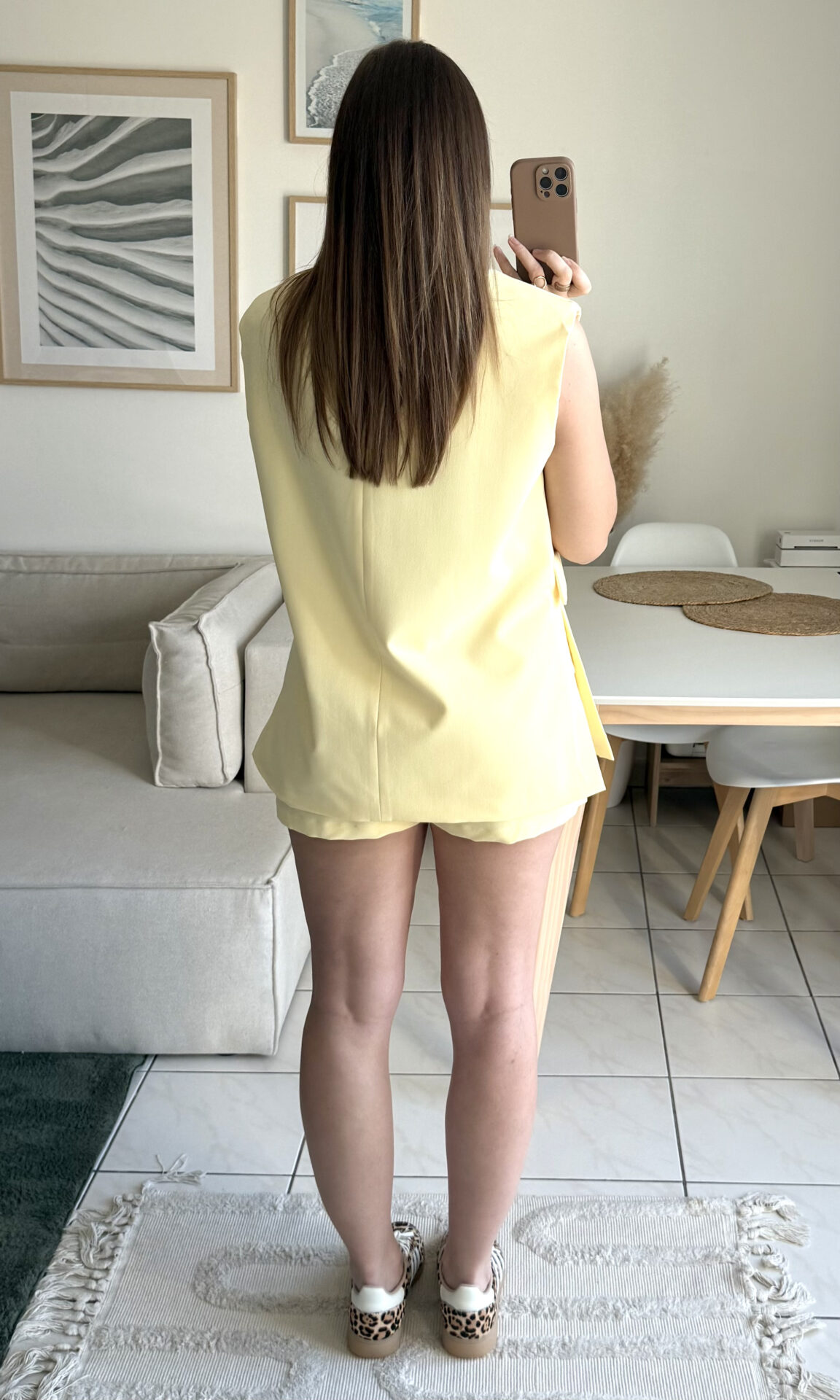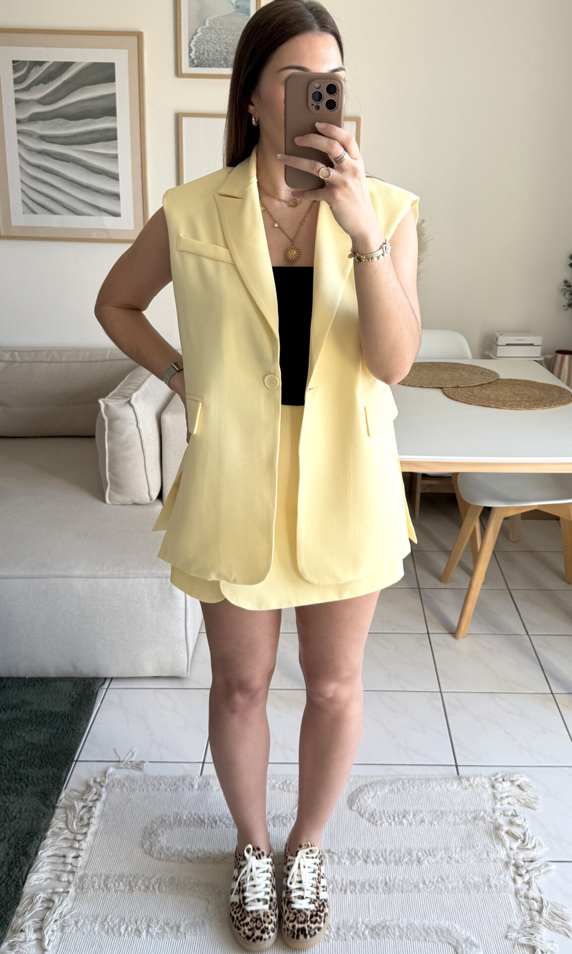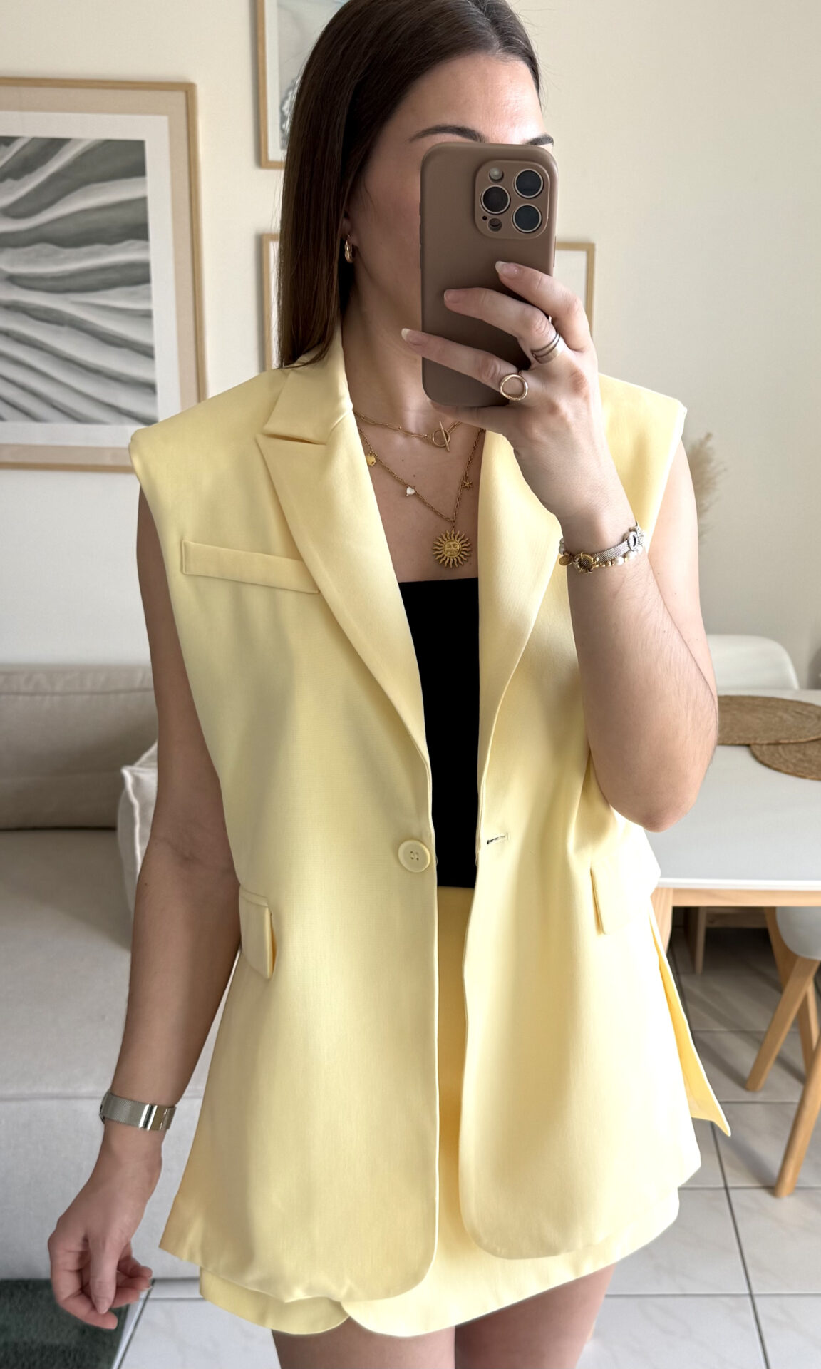 Affirmez votre style avec notre blazer sans manche d’un jaune pastel doux et lumineux. Une pièce tendance qui combine modernité & élégance, idéale pour structurer une tenue simple !