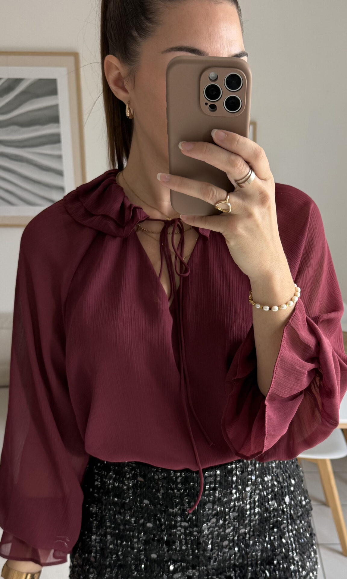 Apportez une touche de romantisme à vos tenues avec Memphys, la blouse en voile burgundy. Légère et fluide, elle offre un tombé élégant & aérien. Quant à ses manches « ballon », elles ajoutent du volume & du caractère.