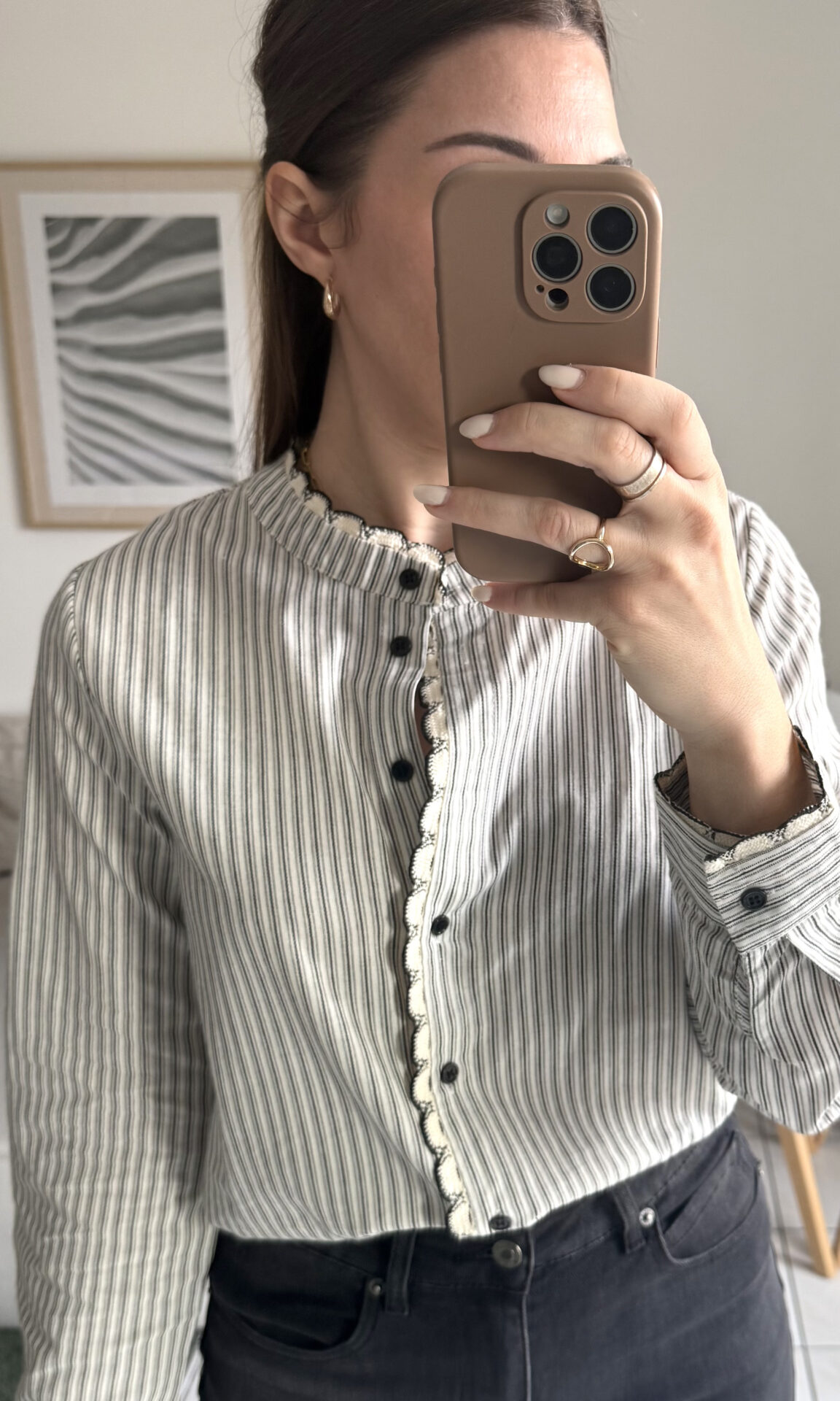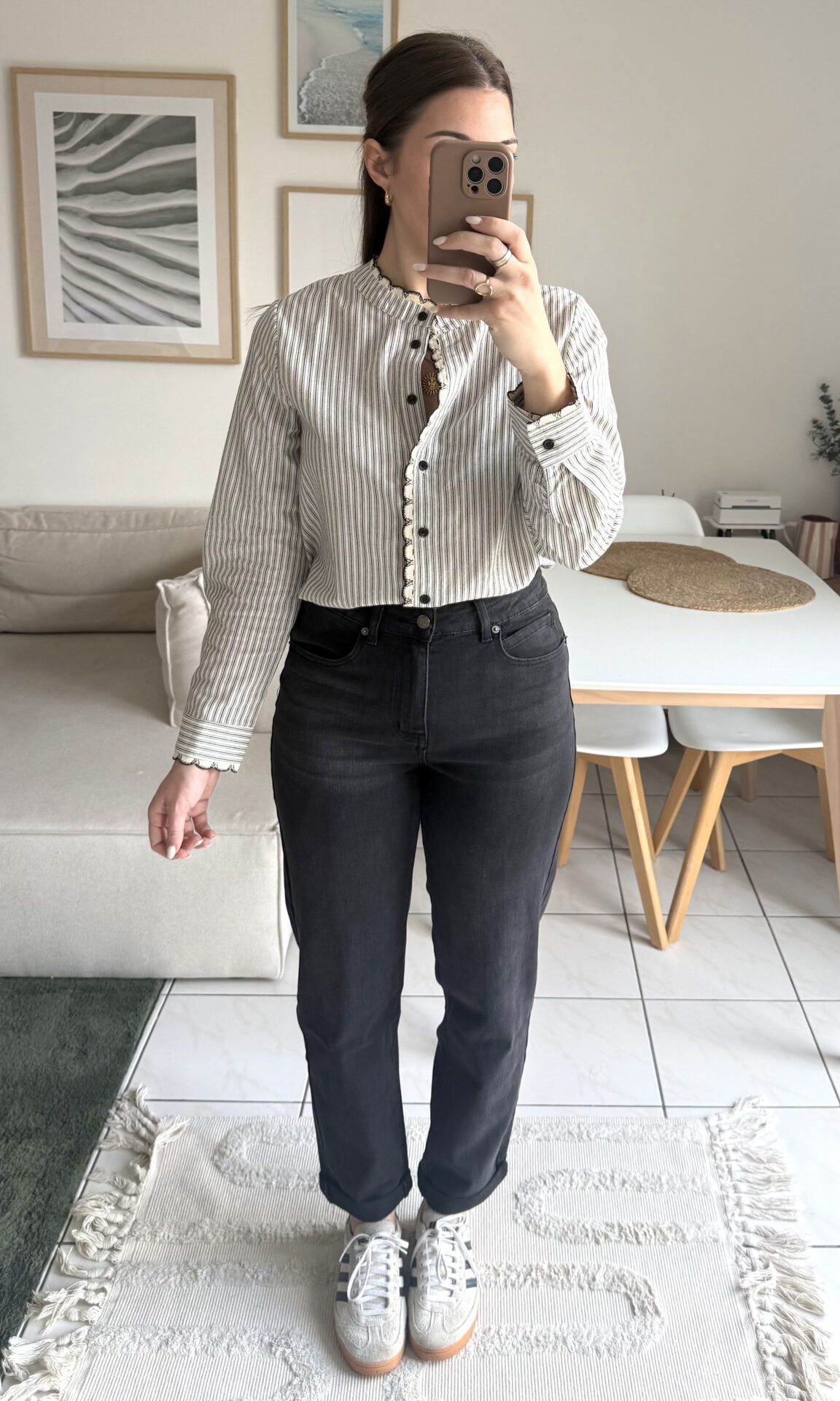 – Ici associée au jean mom Jules & à des baskets pour un look décontracté. Associez-la à un pantalon tailleur ou une jupe unie pour une tenue plus habillée !