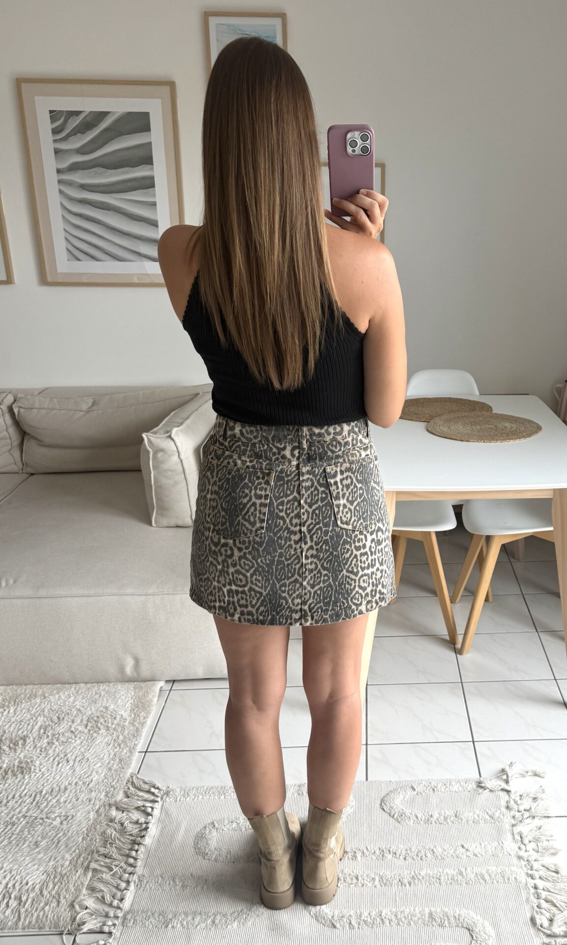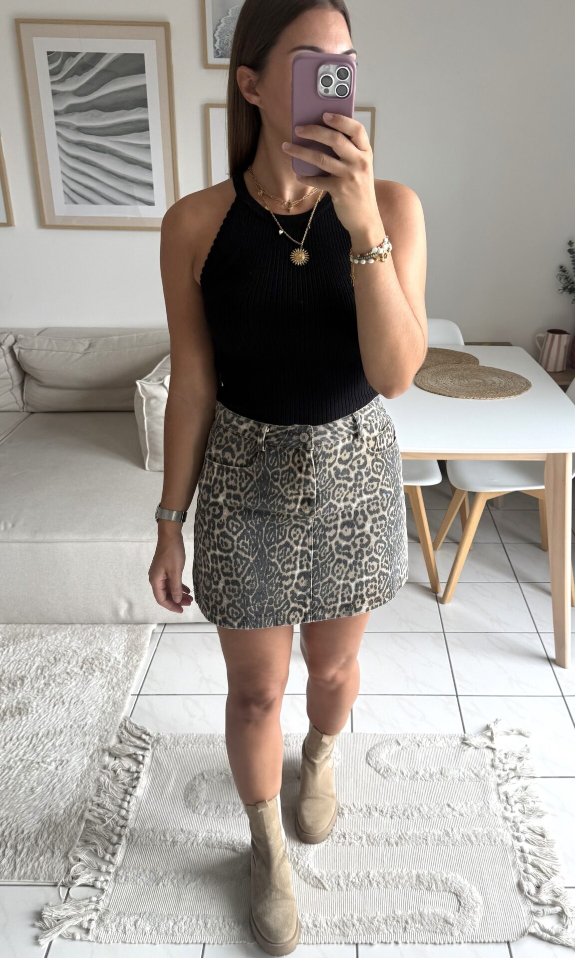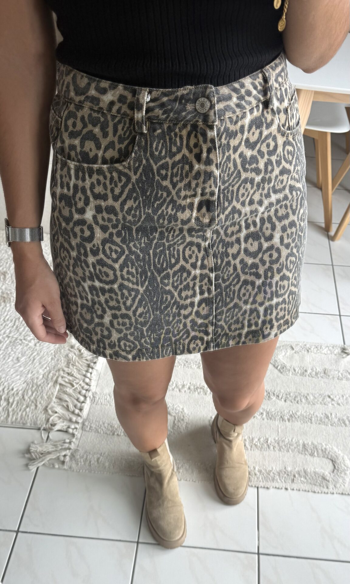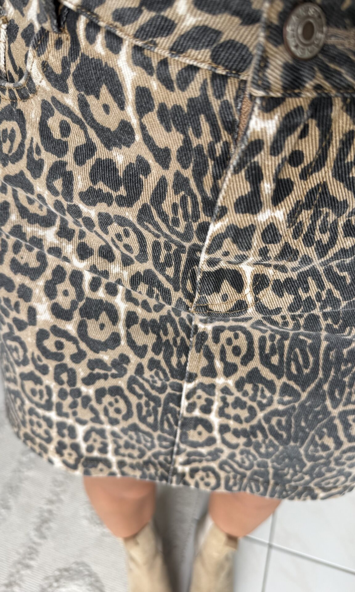 Comment ne pas craquer pour cette jolie jupe en jean aux motifs tendances léopard ! S’associe parfaitement avec des couleurs neutres telles que le noir, le marron, le beige que des couleurs plus pep’s telles que le rose, le rouge, le bleu.