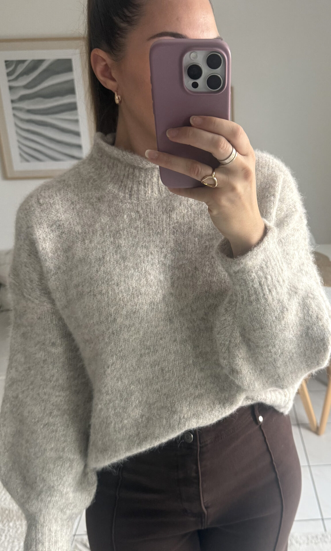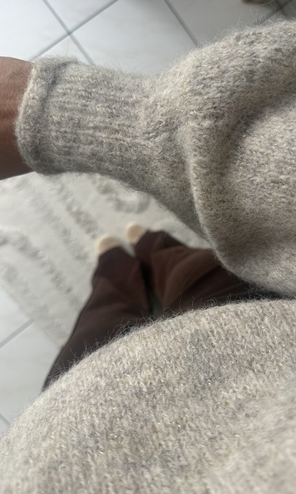 LIAM : sa maille douce & moelleuse enveloppe le corps, ses manches « ballon » apportent du volume pour une allure moderne & sa couleur taupe chiné illuminée par de discrets fils brillants s’accorde facilement avec toutes vos tenues !