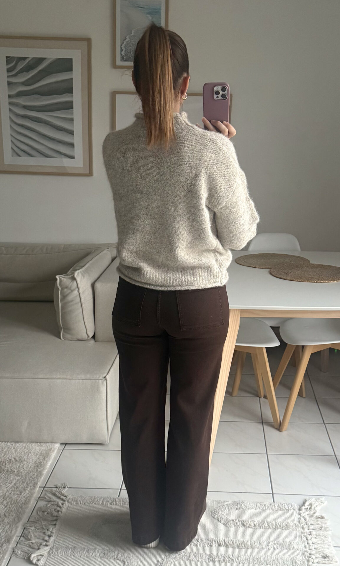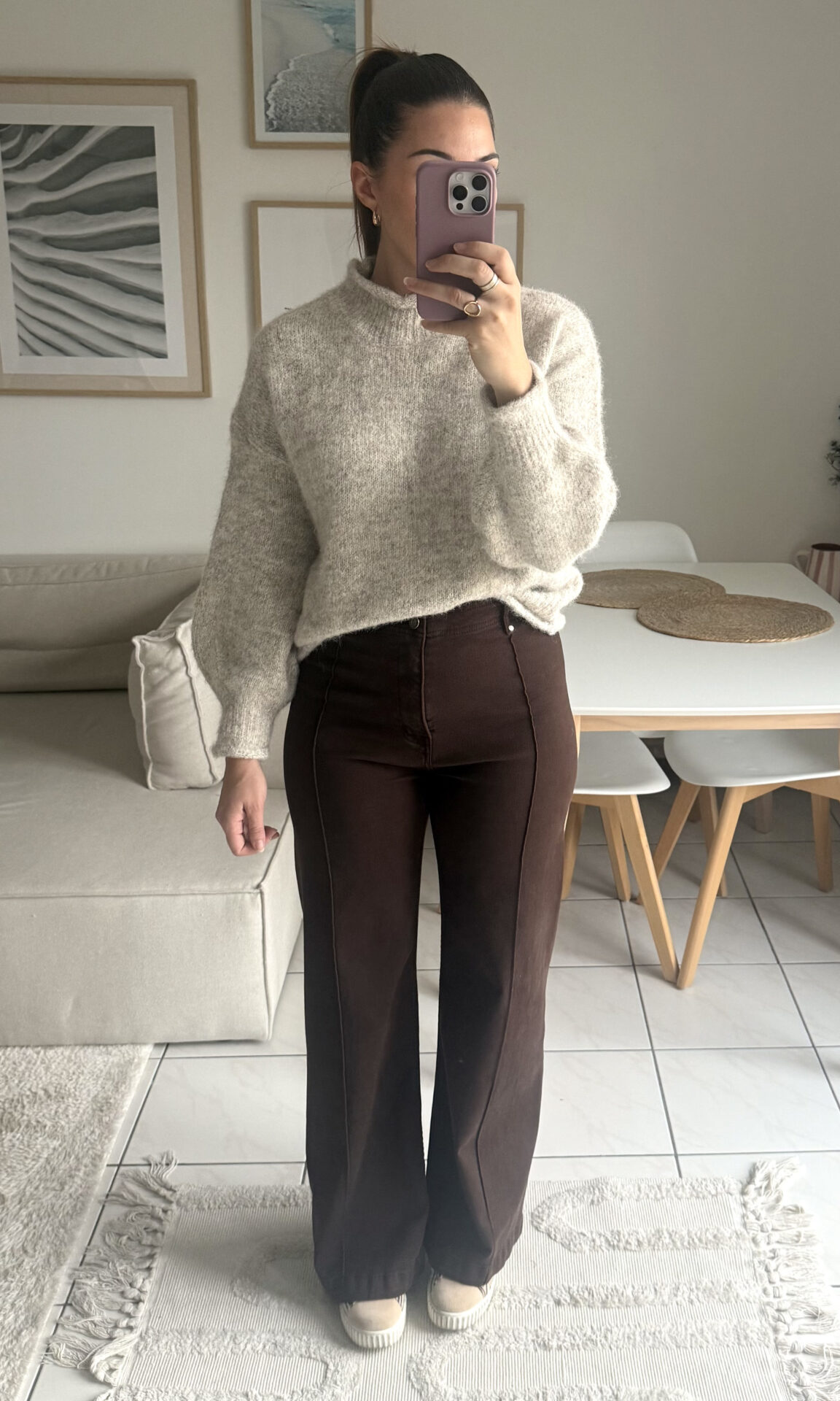 – Ici associé au jean marron Léandre pour un look d’automne cocooning garanti