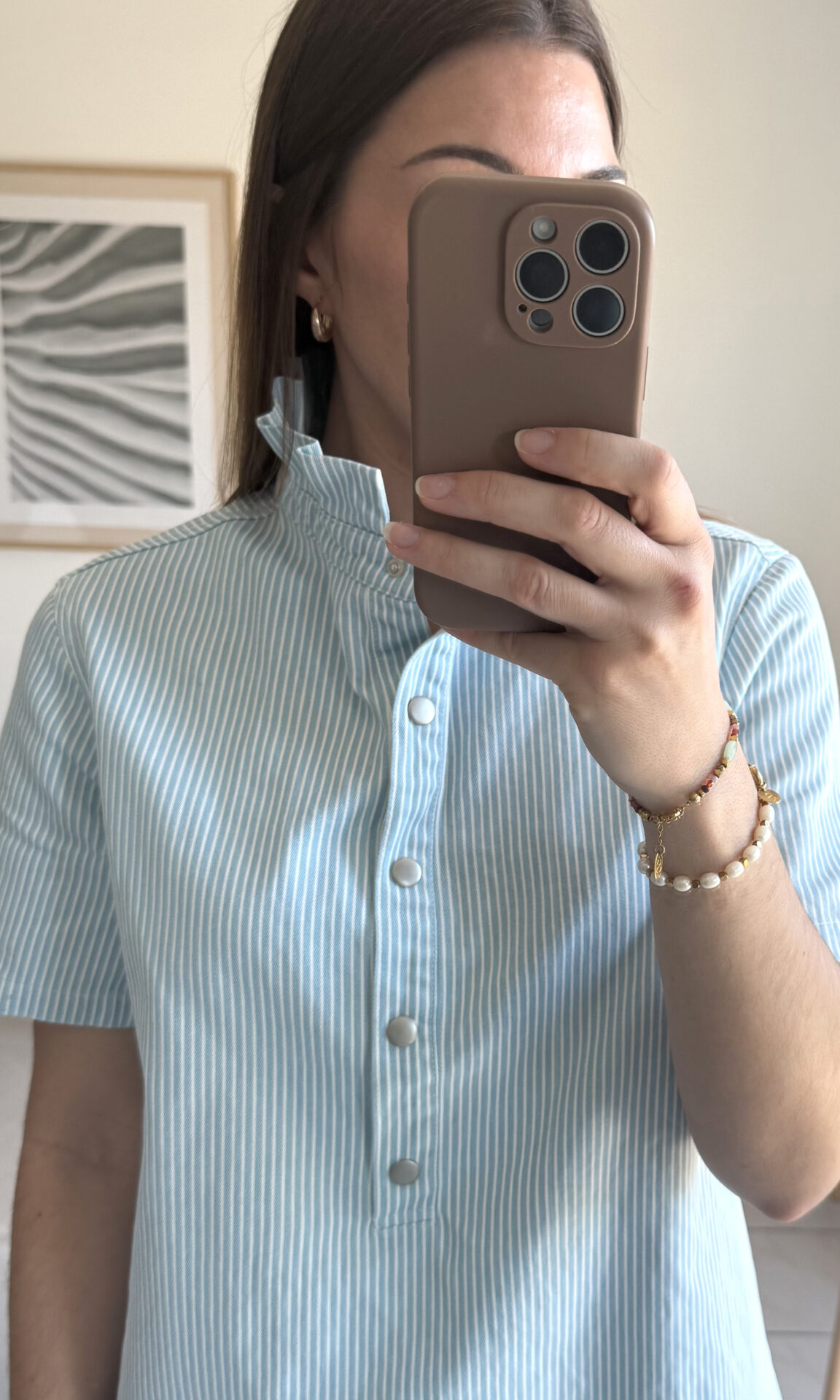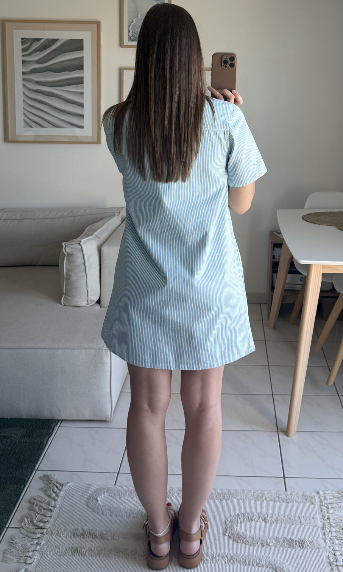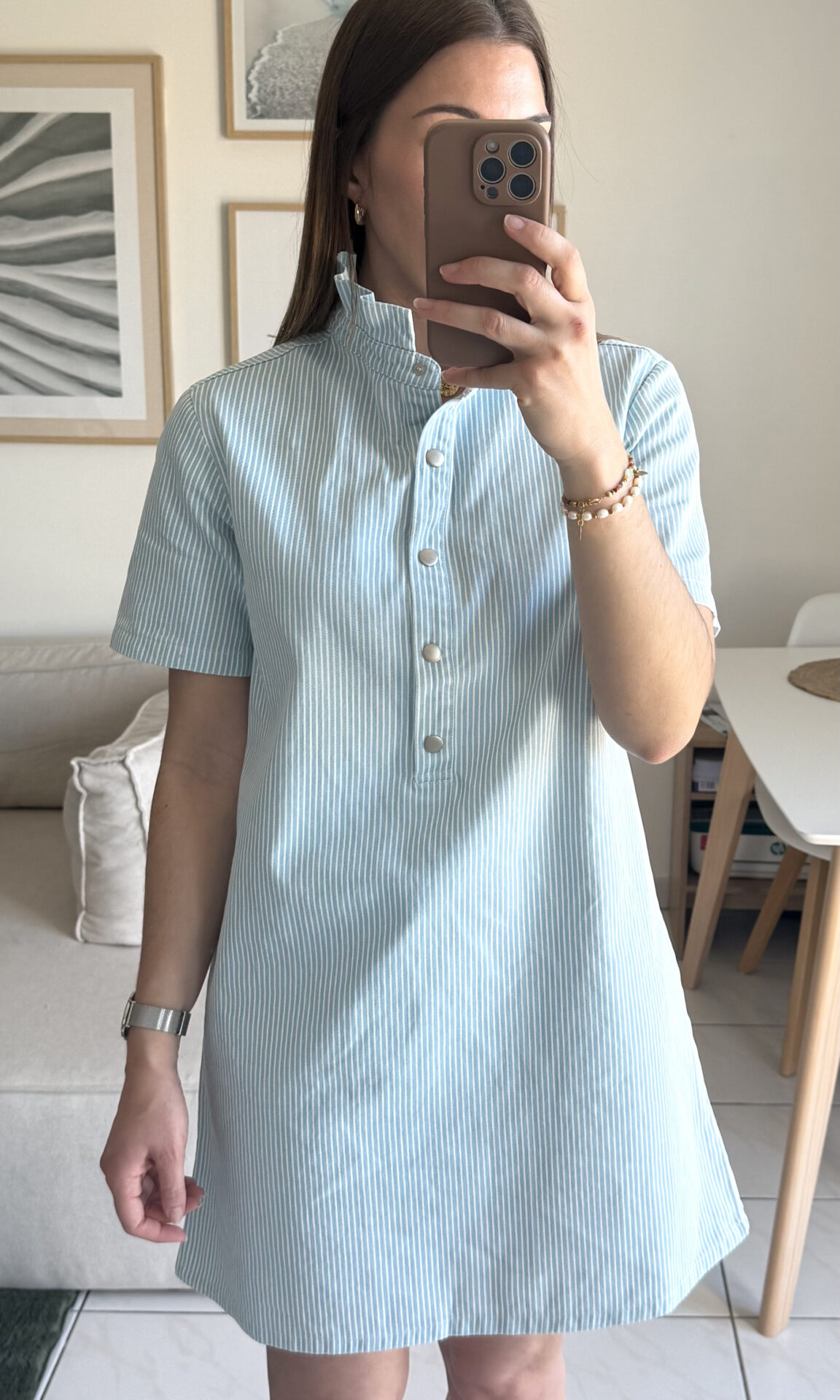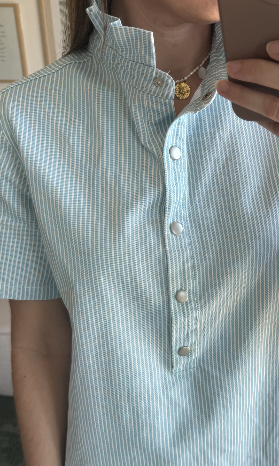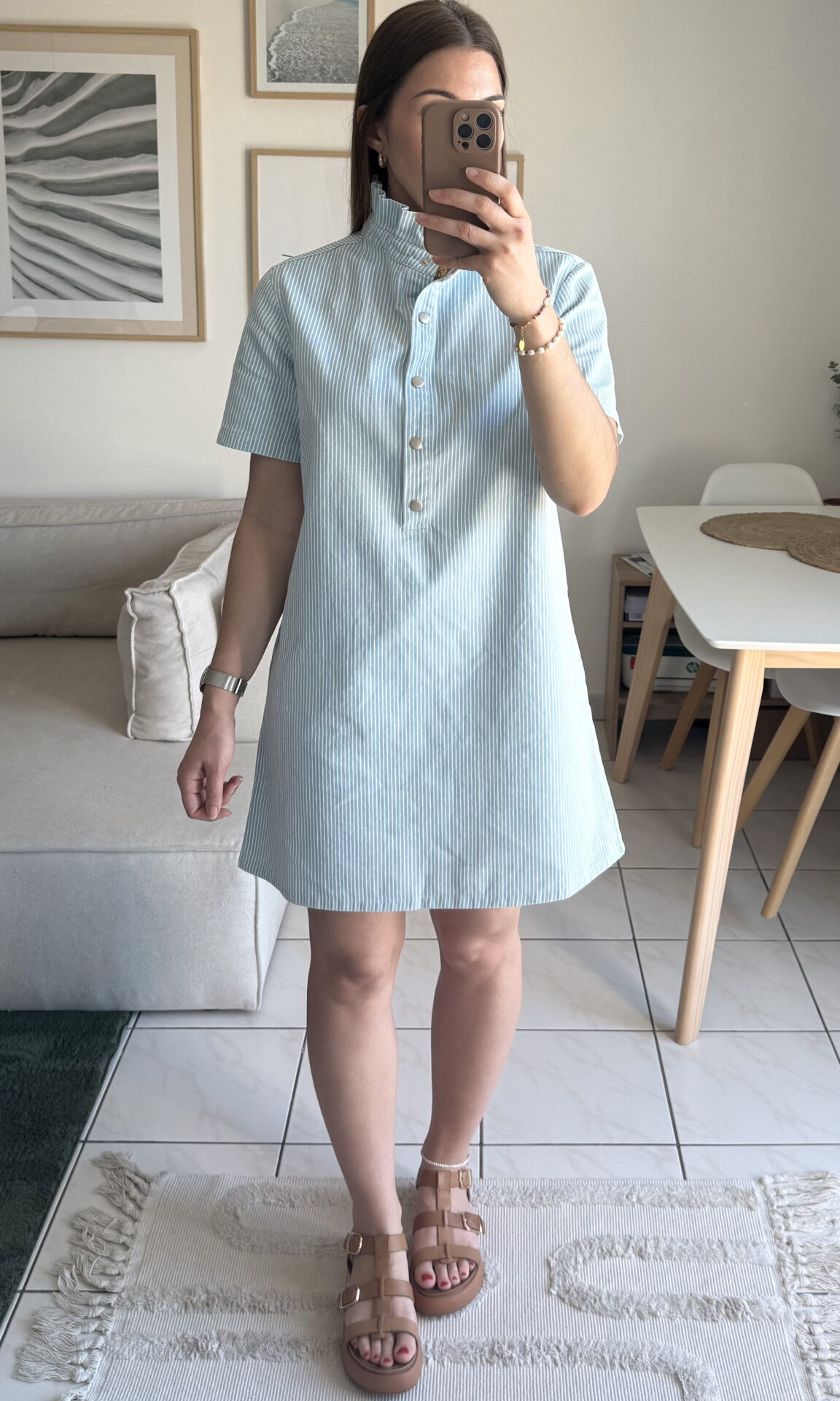 Découvrez l’alliance parfaite entre le charme rétro & l’élégance moderne avec la robe Louna en denim rayé bleu turquoise & blanc. Classique intemporel ici revisité par son col montant à volants ajoutant une touche romantique et féminine à un tissu robuste et structuré.