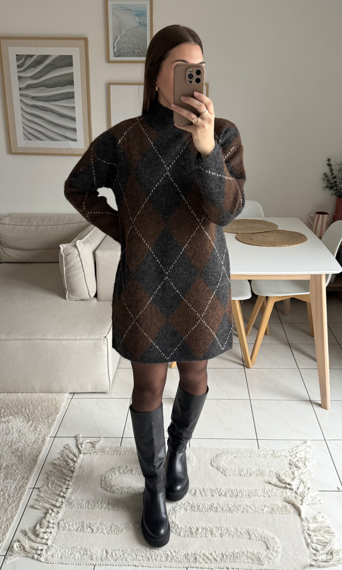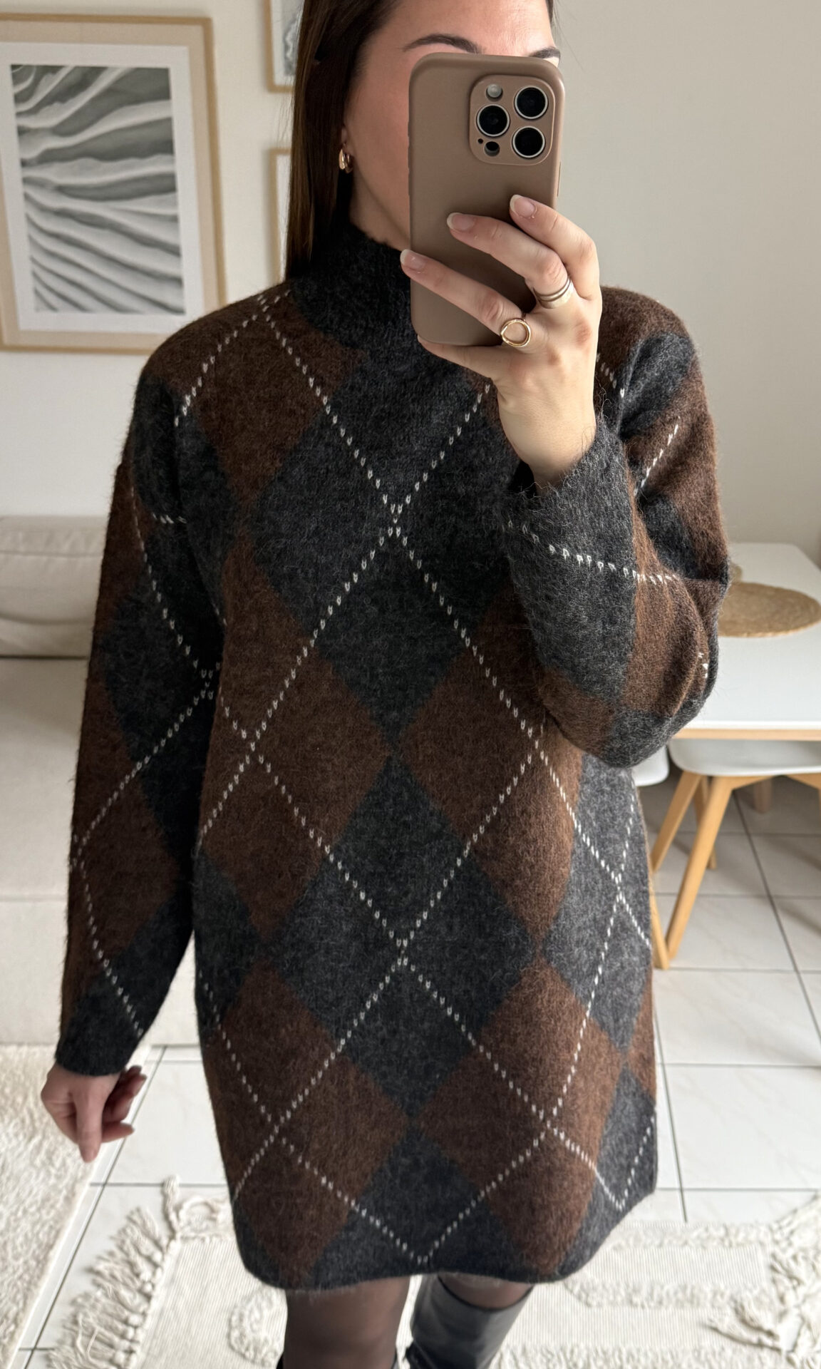 Craquez pour cette robe-pull jacquard aux motifs carreaux gris foncé et marron, à la fois chaude, tendance & confortable ! Parfaite pour la saison automne-hiver !
