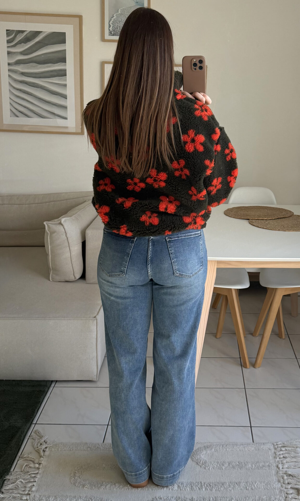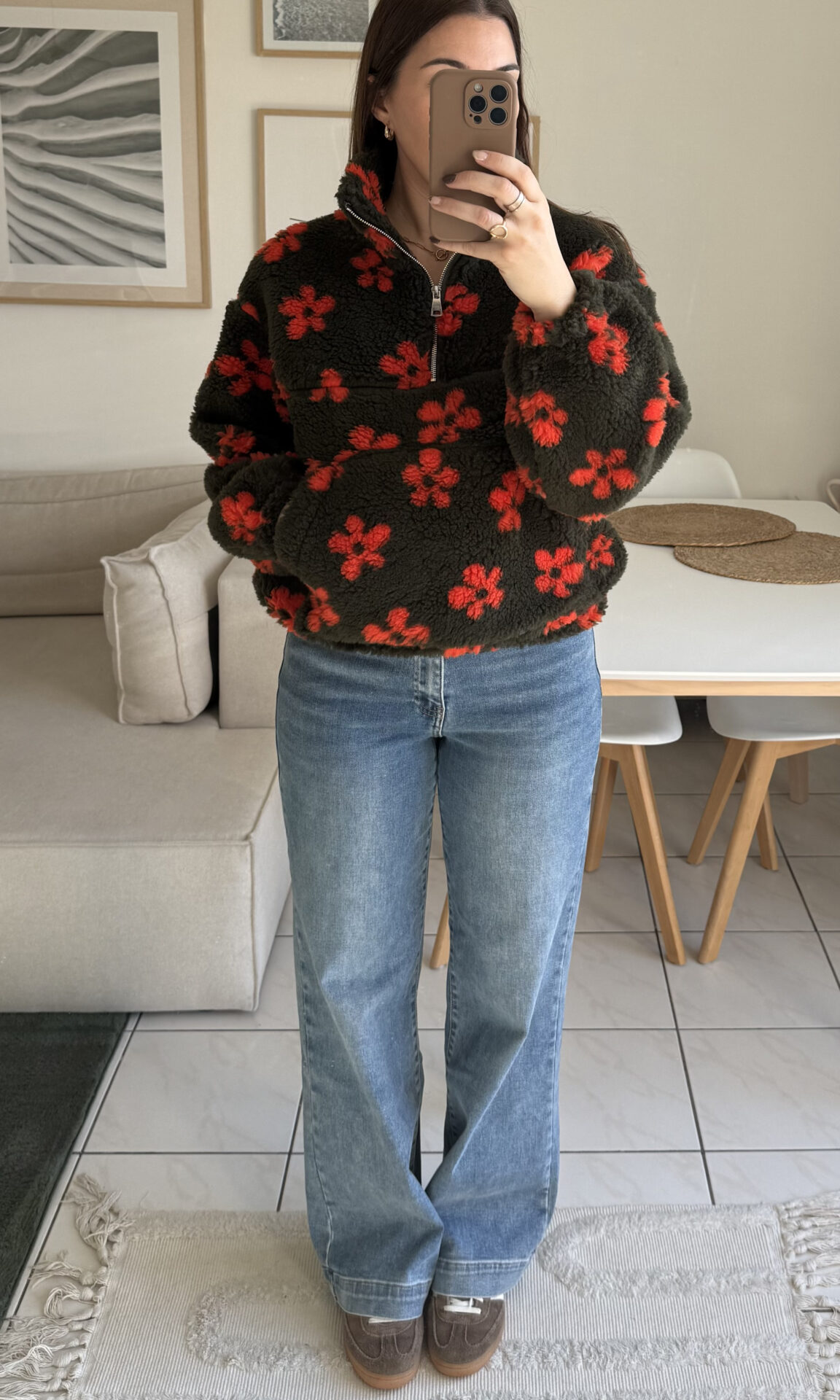 Optez pour le confort absolu avec Flore, le sweat en moumoute kaki aux fleurs oranges apportant une touche d’originalité ! Associez-le à un legging pour une tenue cocooning ou à un jean dad-fit pour un look casual !