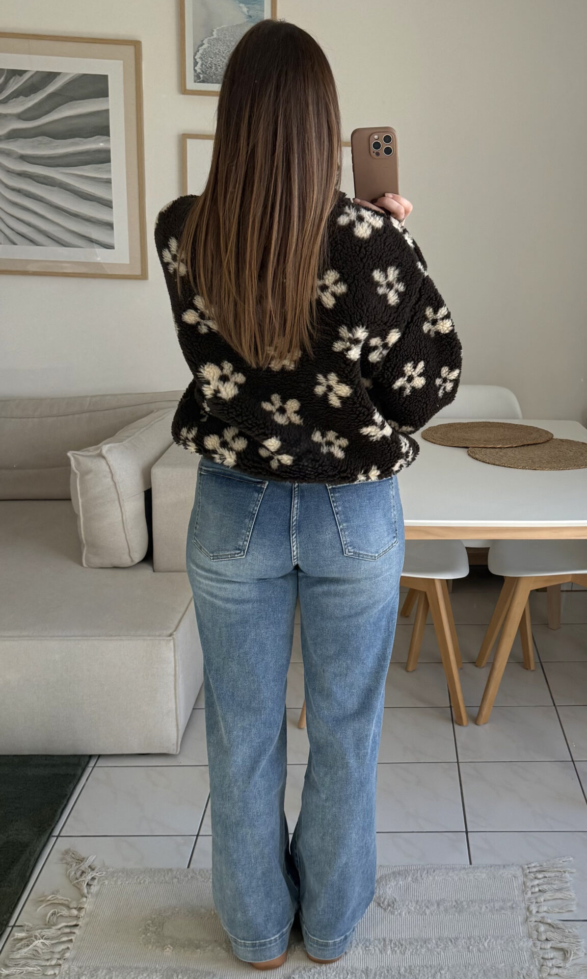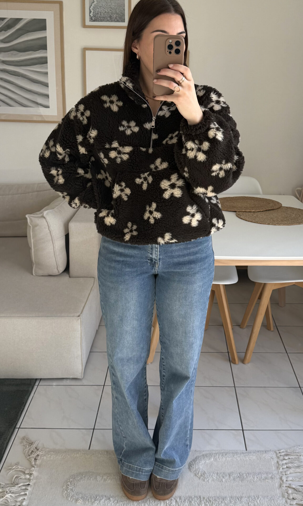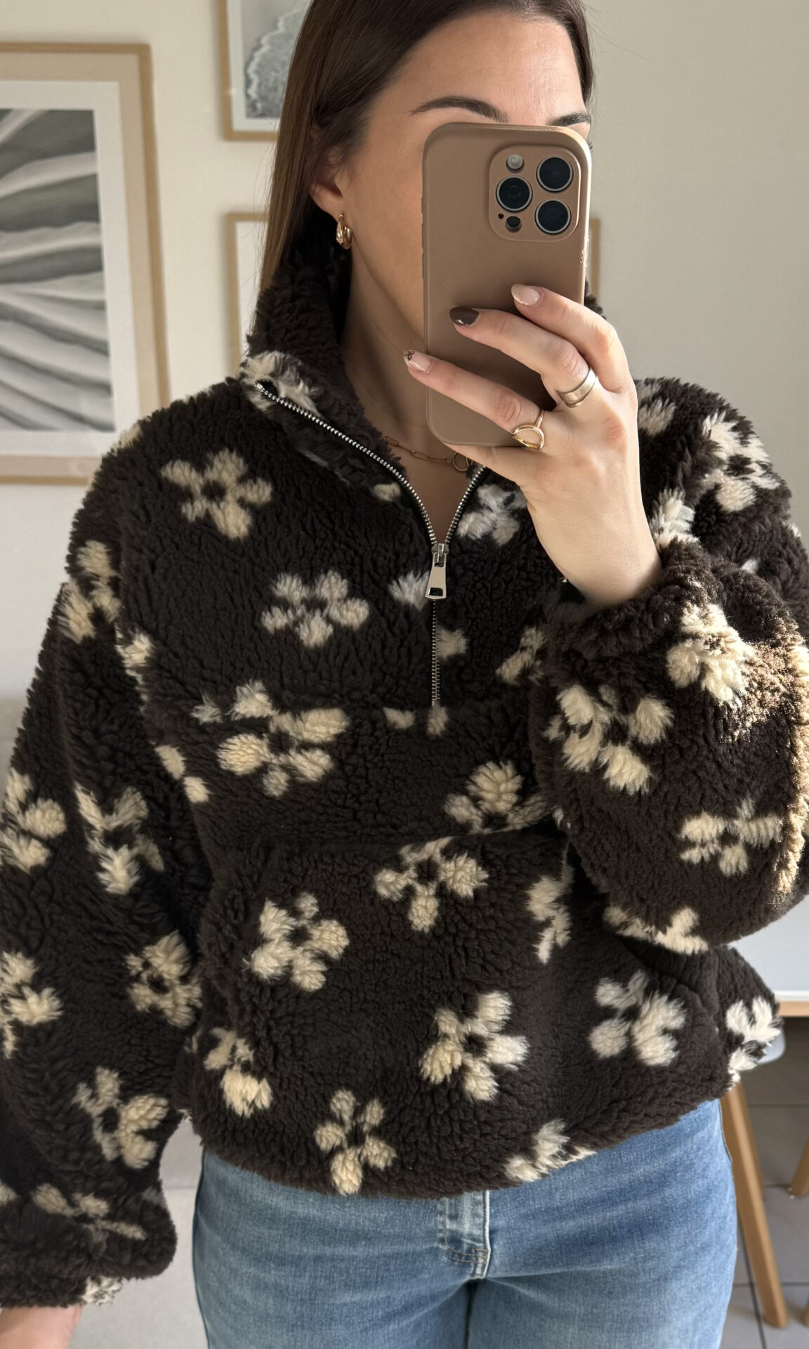 Optez pour le confort absolu avec Flore, le sweat en moumoute marron à fleurs ! Associez-le à un legging pour une tenue cocooning ou à un jean dad-fit pour un look casual !