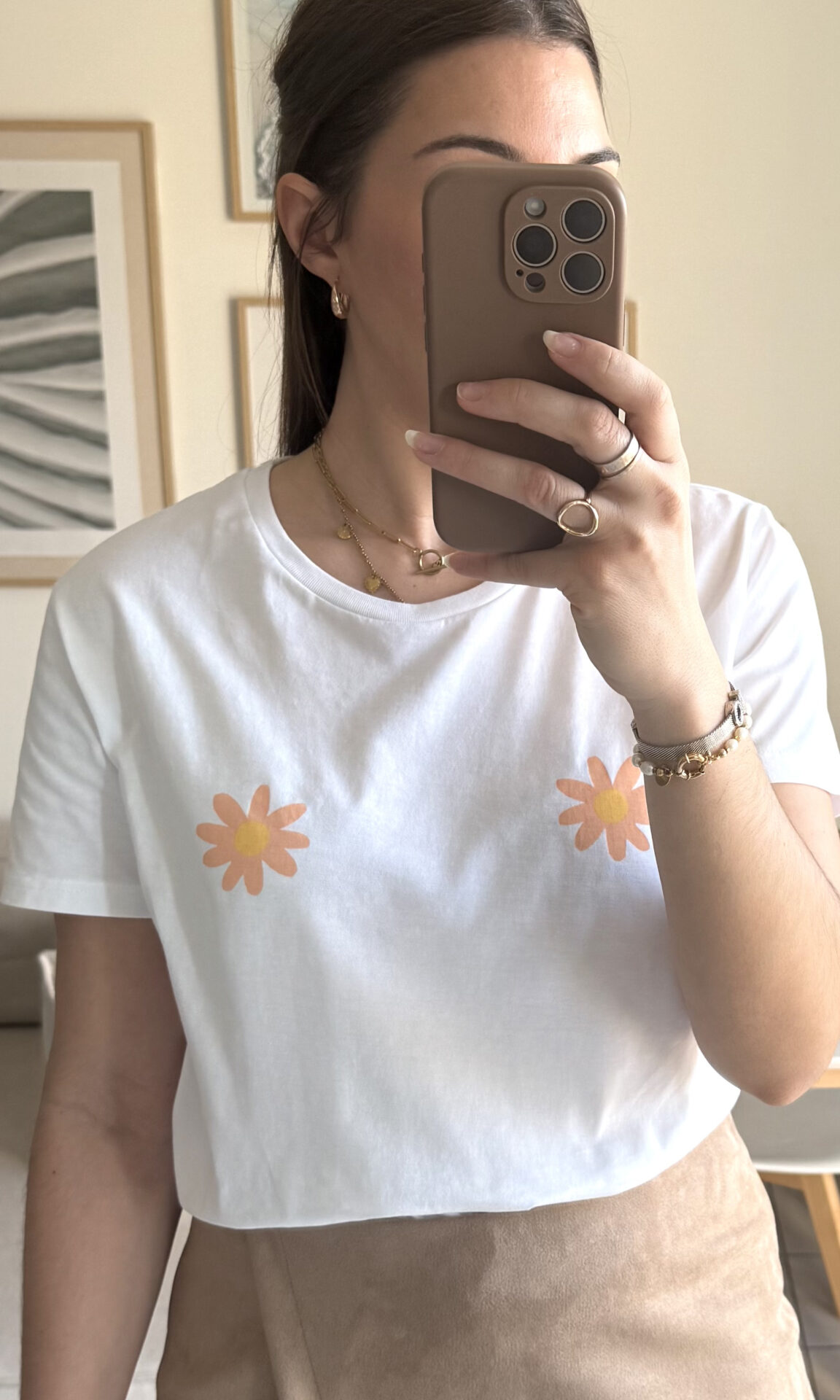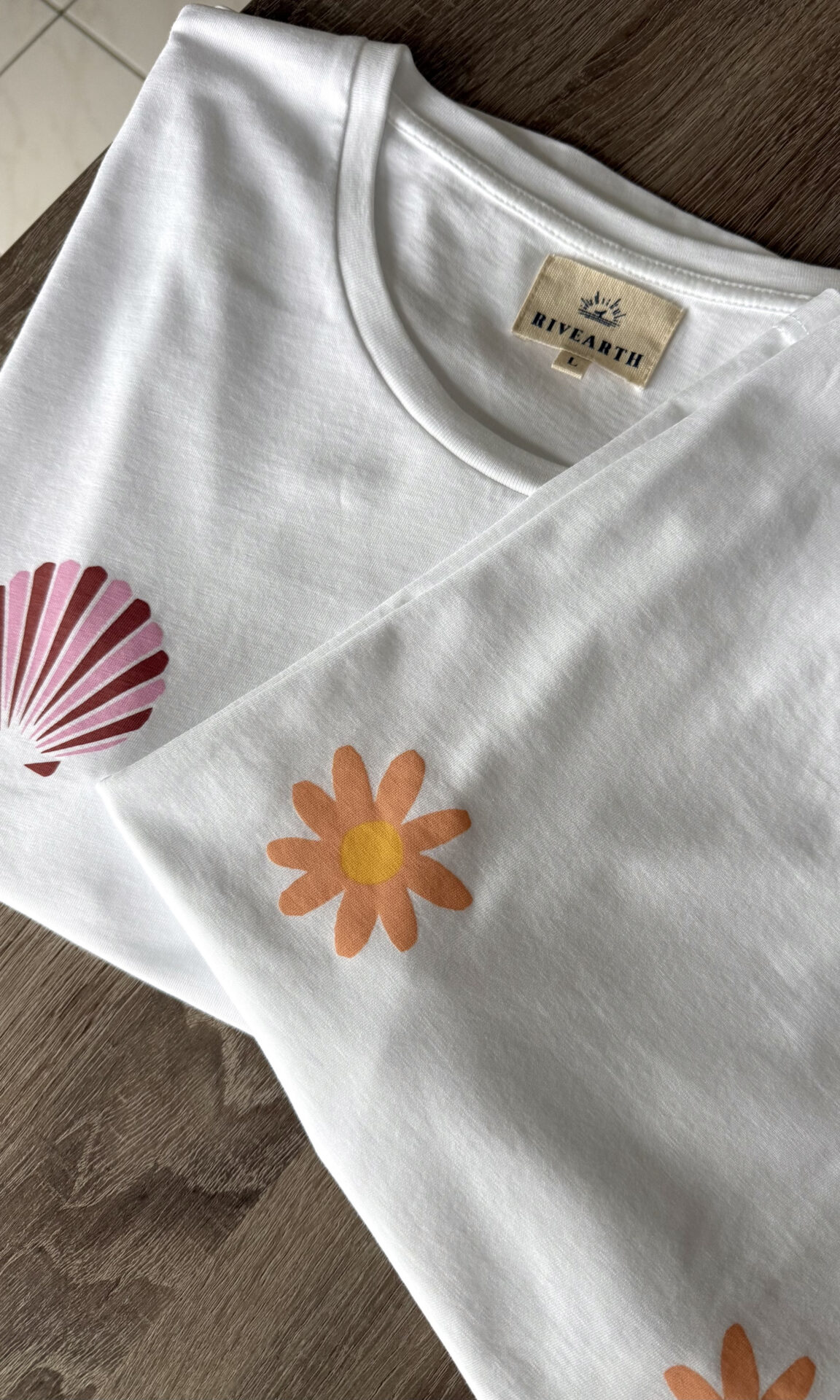 Découvrez notre t-shirt blanc en coton 100% Bio, fabriqué au Portugal. Une pièce essentielle revisitée avec des imprimés tendances qui apportent une touche de soleil & de légèreté. Idéal pour celles qui recherchent une mode plus consciente sans compromis sur le style !