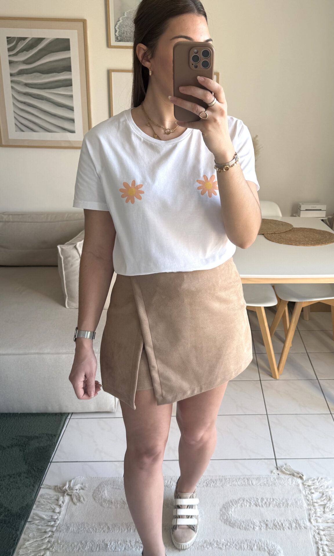 – Ici associé à la jupe-short Savannah. Peut également se porter avec une jupe fluide ou un short en été, sous un blazer pour un contraste moderne, avec un jean taille haute pour un look casual-chic.