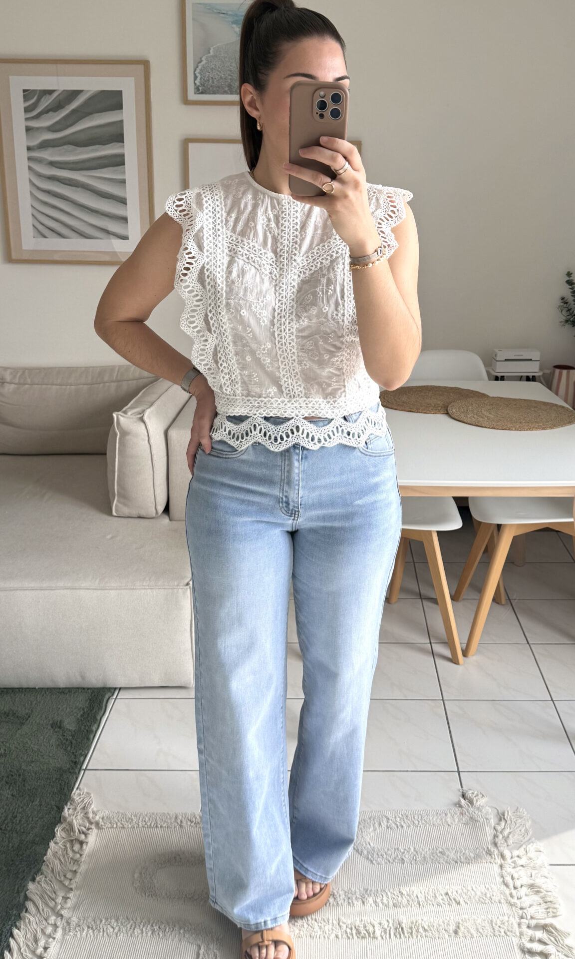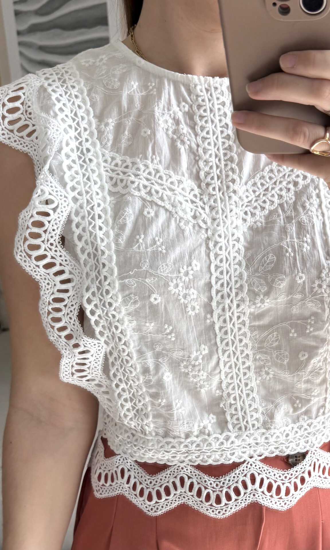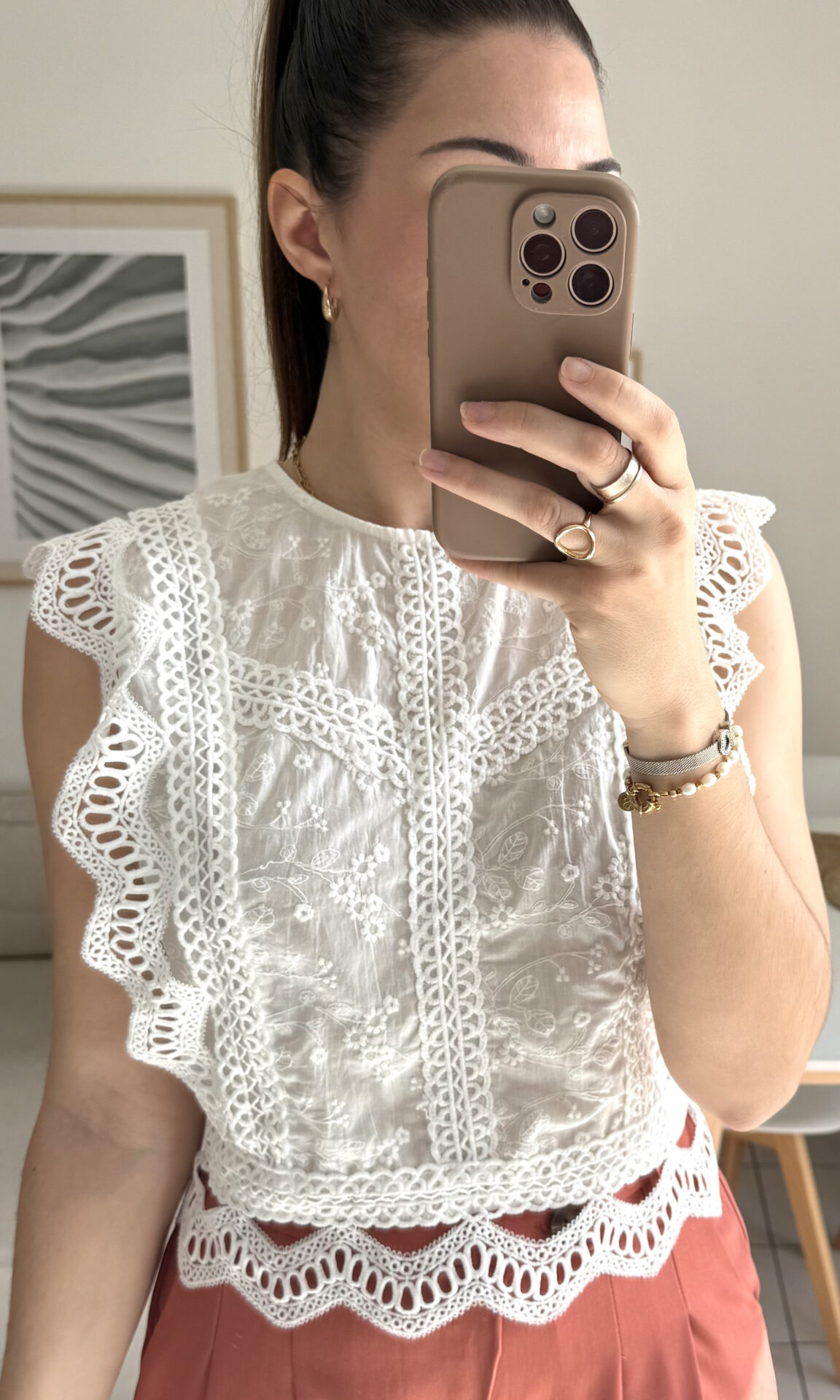 On craque pour le top blanc en coton Aglaé : lumineux & d’une élégance naturelle avec ses fins motifs floraux brodés ainsi que ses délicates & originales broderies ajourées.