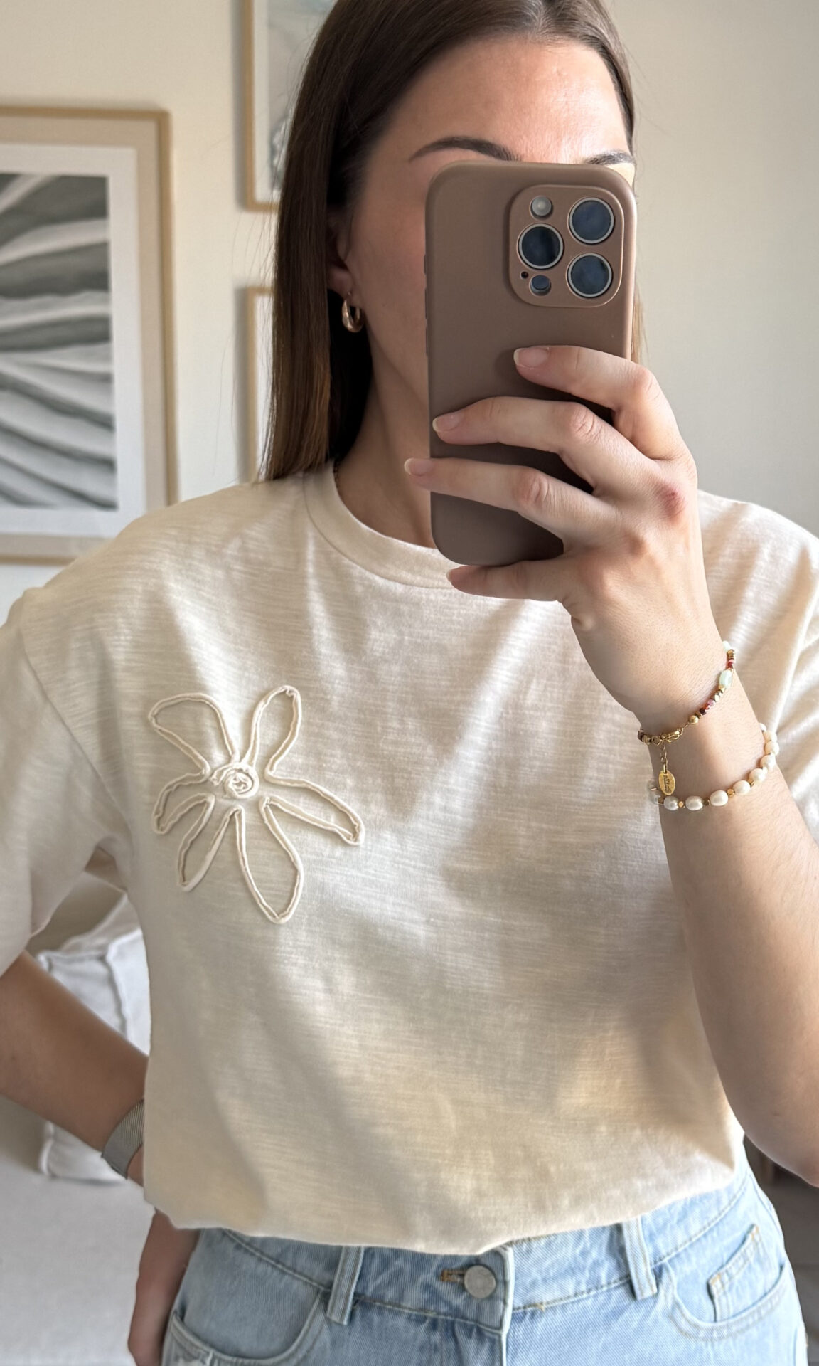 Lio, t-shirt beige en coton, une pièce essentielle du vestiaire féminin revisitée avec délicatesse par sa jolie fleur en relief subtilement placée au niveau de la poitrine ! Sa couleur neutre s’associe avec tout, sa matière douce offre un confort absolu et sa coupe un peu loose s’adapte à toutes les silhouettes.