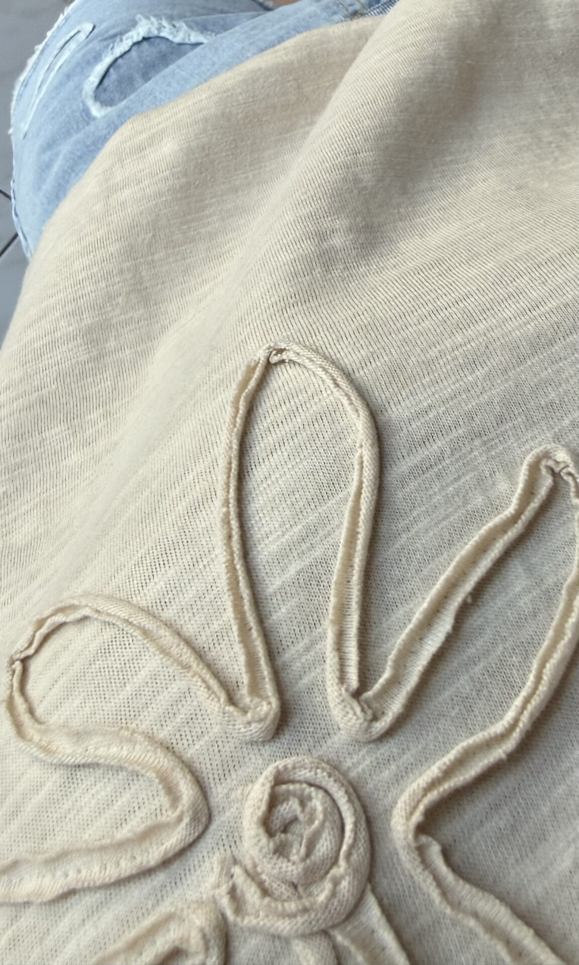 – Beige effet délavé avec une fleur en relief au niveau de la poitrine